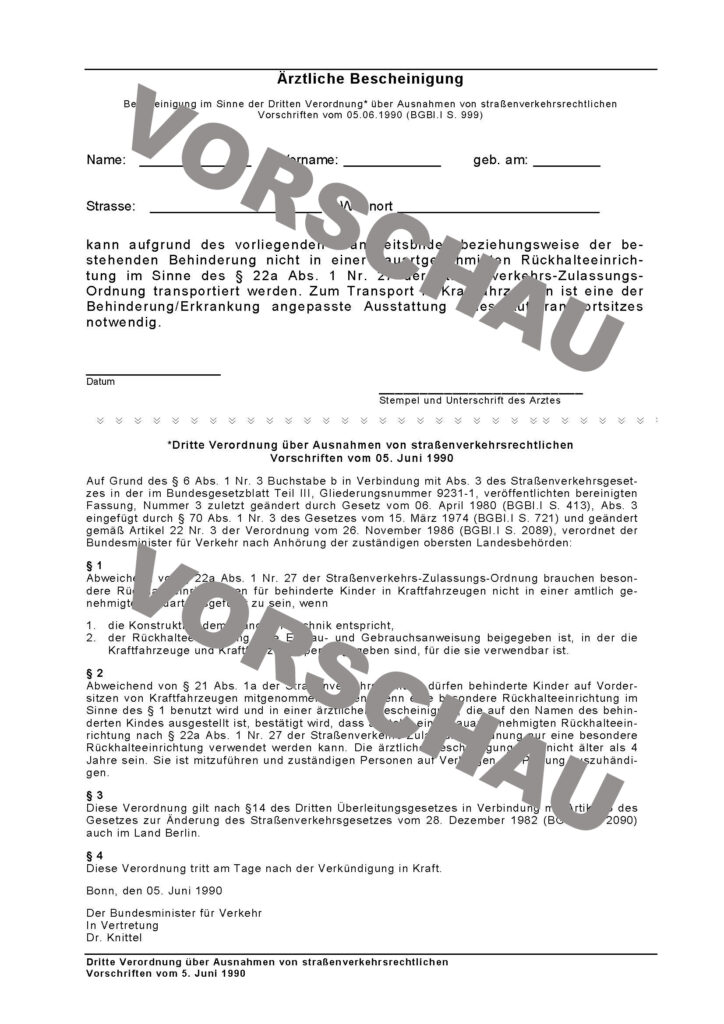 Für alle anderen, nachträglich modifizierten Auto-Kindersitze ohne Sicherheitsprüfung muss grundsätzlich eine ärztliche Bescheinigung von den Eltern mitgeführt werden. Hierin wird bestätigt, dass das Kind nur diese spezielle besondere Rückhalteeinrichtung im Auto nutzen kann. Diese Bescheinigung muss alle 4 Jahre neu überprüft und ausgestellt werden.